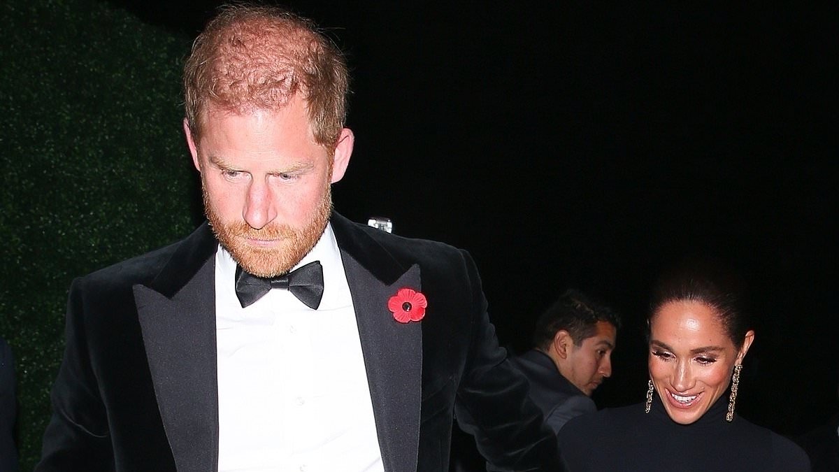 While Harry wore a stern expression as he headed into the beano, Meghan, holding his hand and trailing just behind him , was aglow with an ear-to-ear smile