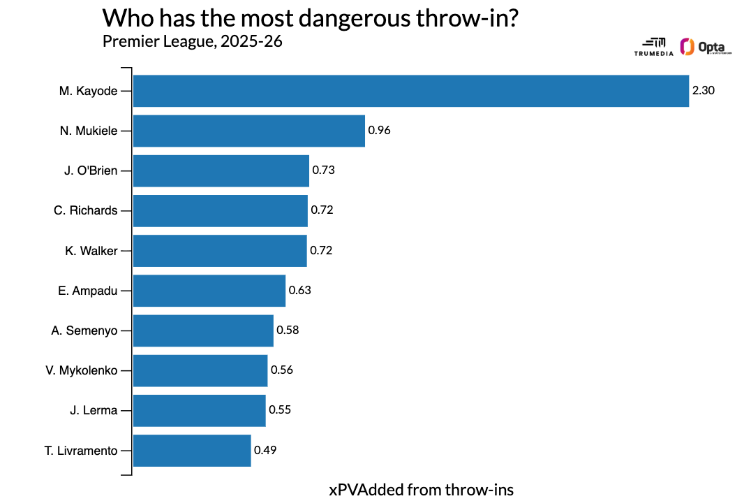That’s anticipated possession worth created from throw-ins, and EPV determines how a lot a given motion will increase a staff’s possibilities of scoring. Kayode may be higher at throwing the ball into the field than anybody is at the rest.