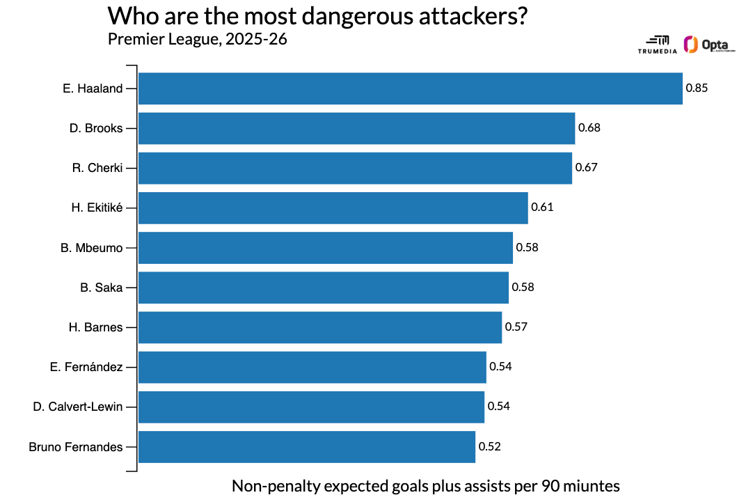The solely motive each Brooks and Cherki are not greater is that they’ve solely performed about 900 minutes, and that is the cut-off I’ve used for the chart. Erling Haaland, in the meantime, has performed over 1,900 minutes.