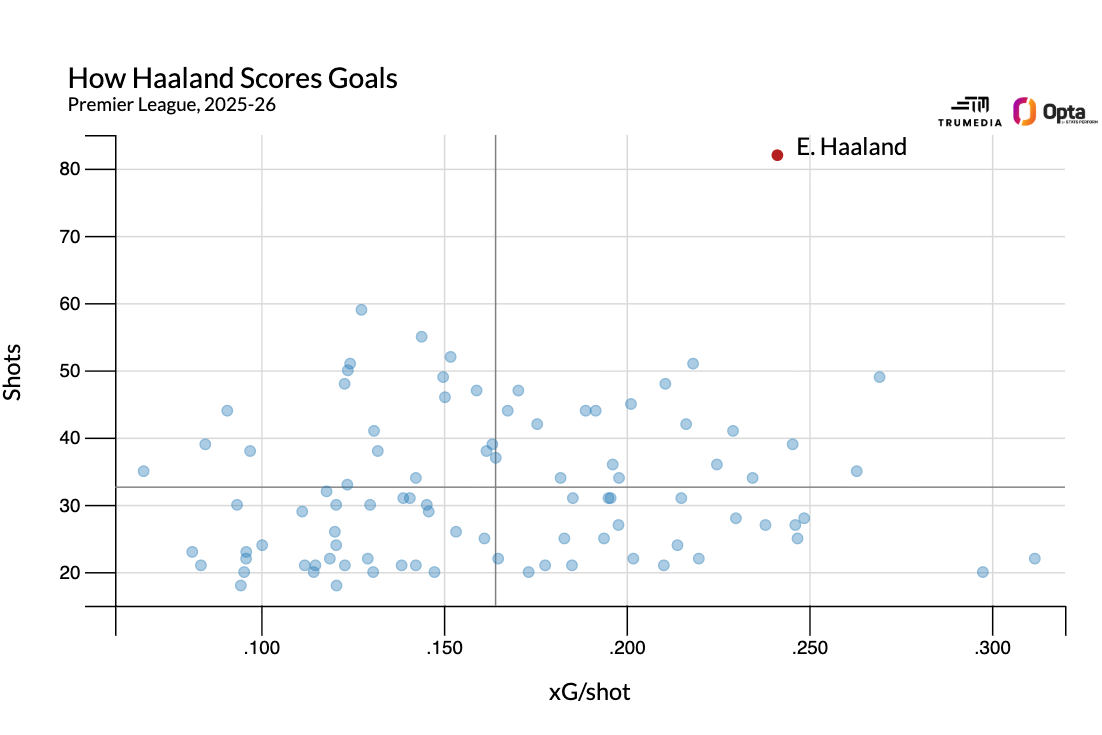 He’s trying far more photographs than everybody else, and solely a pair players are taking higher-probability photographs. Soccer is a recreation of trade-offs — between high quality and amount — except you are a 6-foot-5, blazing quick Norwegian middle ahead who performs for Pep Guardiola. Then, you get to have all of it.