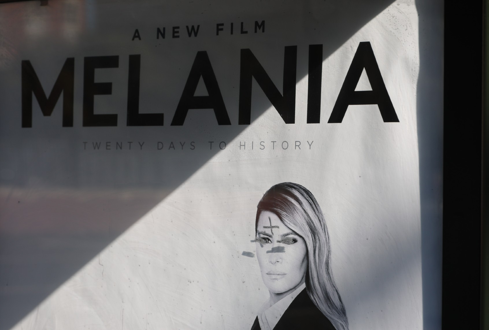 (Allen J. Schaben / Los Angeles Times through Getty Images) A view of a defaced bus cease commercial for the brand new documentary movie about First Lady Melania Trump